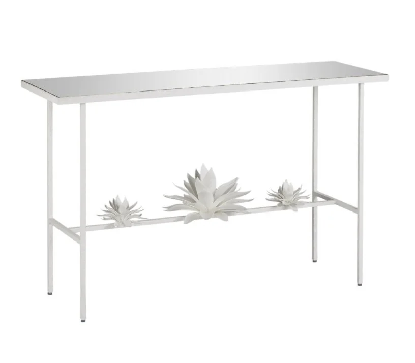 The Sisalana White Console Table was inspired by the flourishing Agave sisalana plant, whose spiky, leathery fronds curl up from the ground just as the petite clumps of leaves on this white console table do. “My love of the Agave plant, of which hundreds of varieties flourish in the Yucatan, has inspired me for many years,” says the table’s designer Marjorie Skouras. Her passion for the Yucatan Peninsula, the surroundings in which she lives and through which she translates the flora and fauna into dynamic products in her studio, shines in this wrought iron table covered in a mix of crisp gesso white and rough gesso white finishes with a mirrored top.